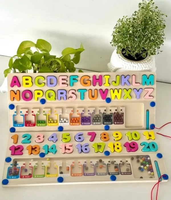 Supažindinkite vaiką su raidėmis, spalvomis ir skaičiais per žaidimą! Ši Montessori įkvėpta medinė magnetinė abėcėlės ir karoliukų rūšiavimo lenta sukurta tam, kad ankstyvasis mokymasis būtų įtraukiantis, aktyvus ir džiuginantis.