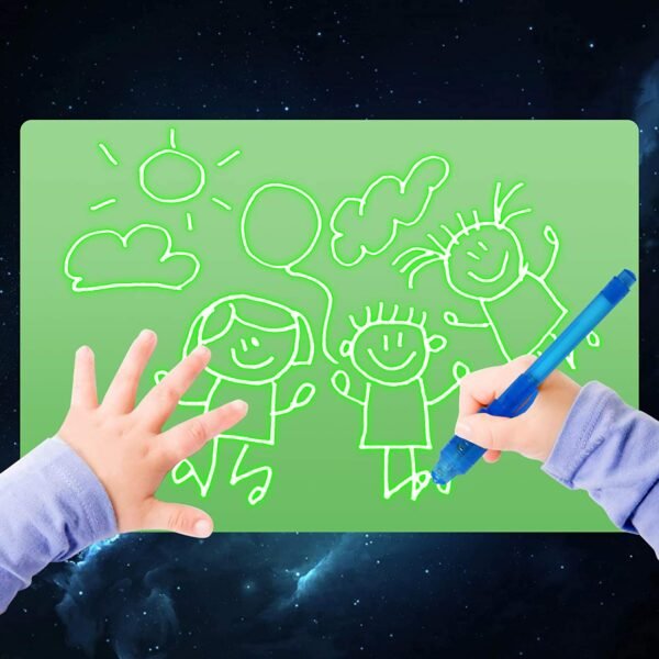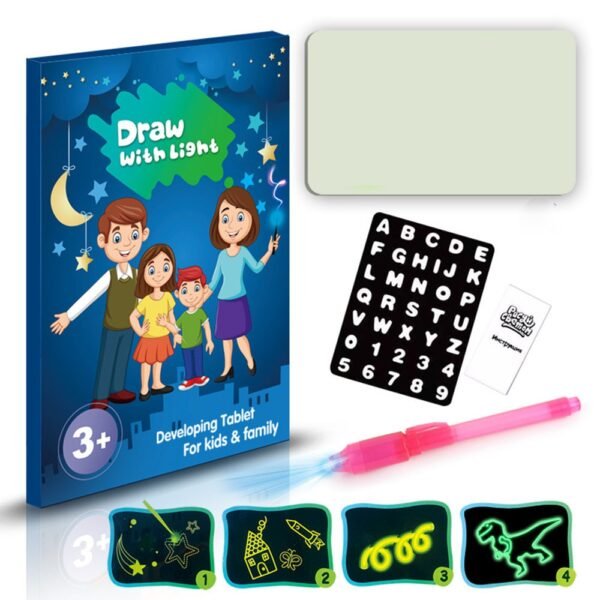 Maginė šviečianti piešimo lenta – kūrybiškas žaislas, leidžiantis vaikams piešti šviesa! 💫 Naudojant specialų šviesos rašiklį, mažieji gali kurti nuostabius piešinius, kurie tamsioje aplinkoje švyti ir pamažu išnyksta, palikdami vietos naujiems kūriniams.